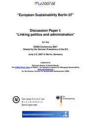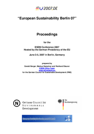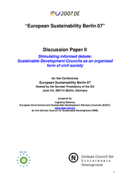 The ESDN Conference 2007 was hosted by the German Council for SD (RNE) as the main sustainability event in the context of the German EU Presidency on 3-5 June in Berlin. The two major topics of the Conference were (a) linking politics and administration and (b) stimulating informed debate in civil society. The two topics were subject to several keynote and dinner speeches, in-depth working group discussions and a sounding panel that consisted of two parliamentarians, one administrator and one civil society representative. Additionally, issues related to the EU SDS (peer reviewing and reporting) were discussed by two panels. Finally, all participants discussed how to develop the ESDN further at the end of the event.
