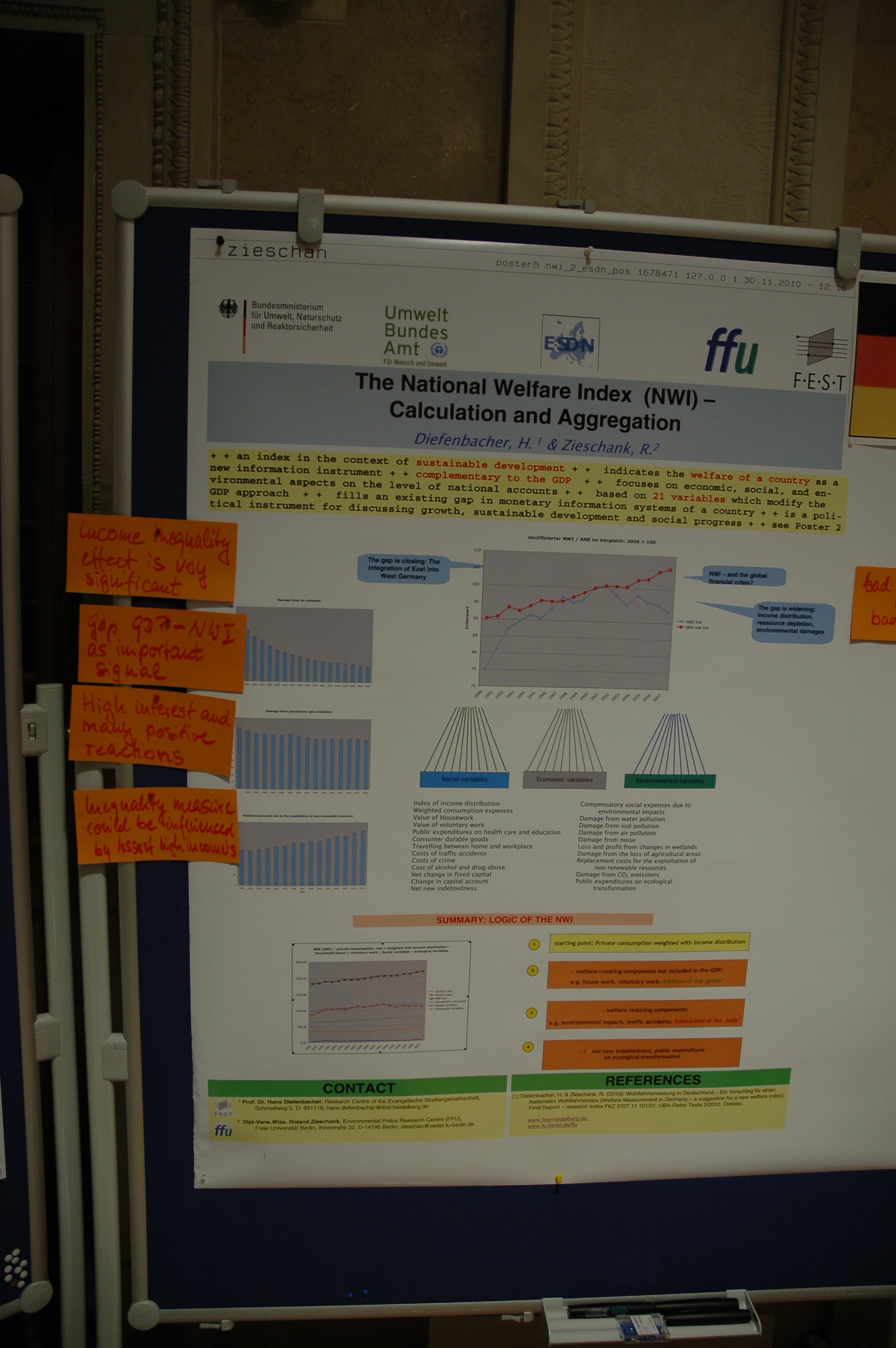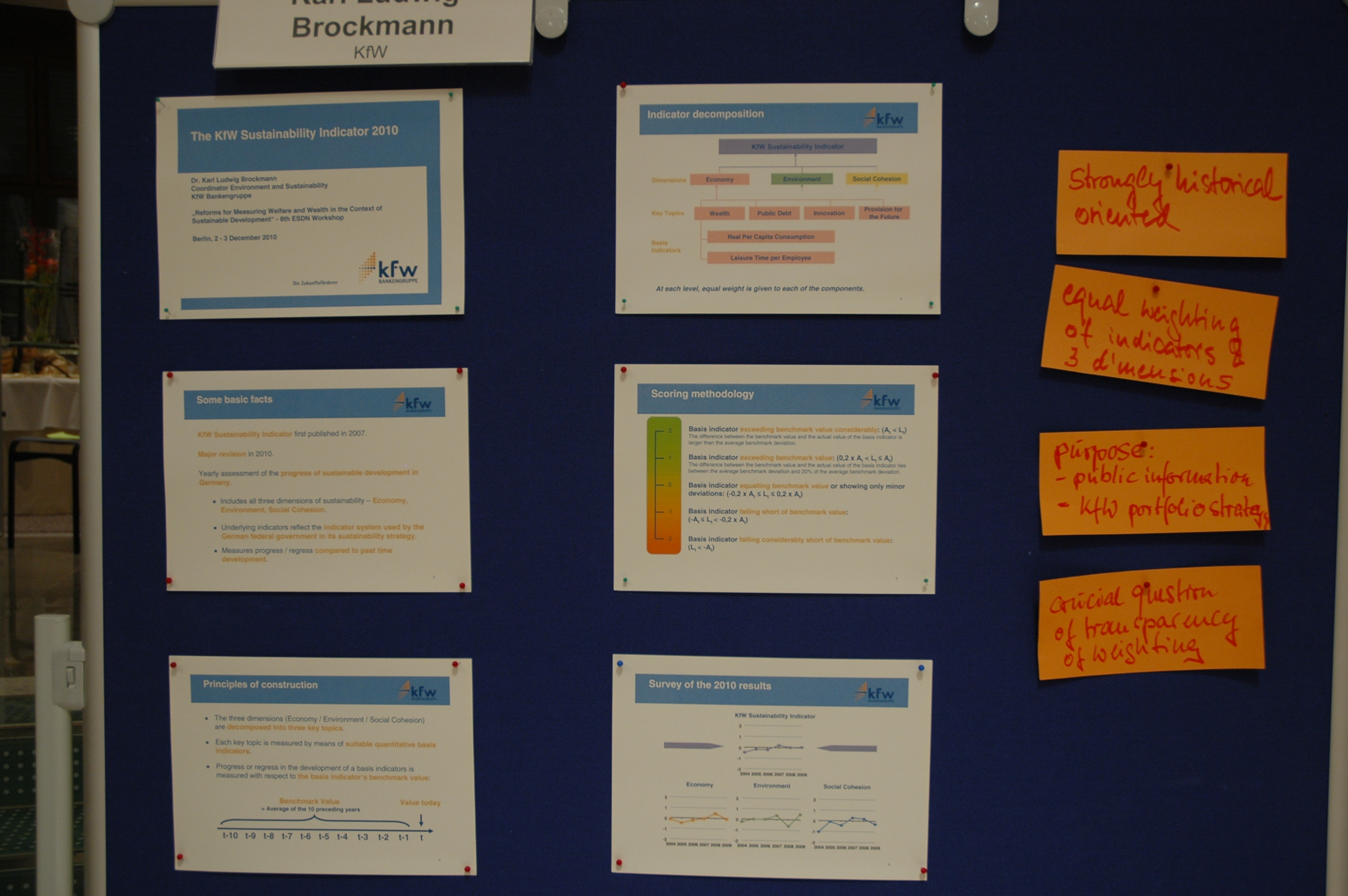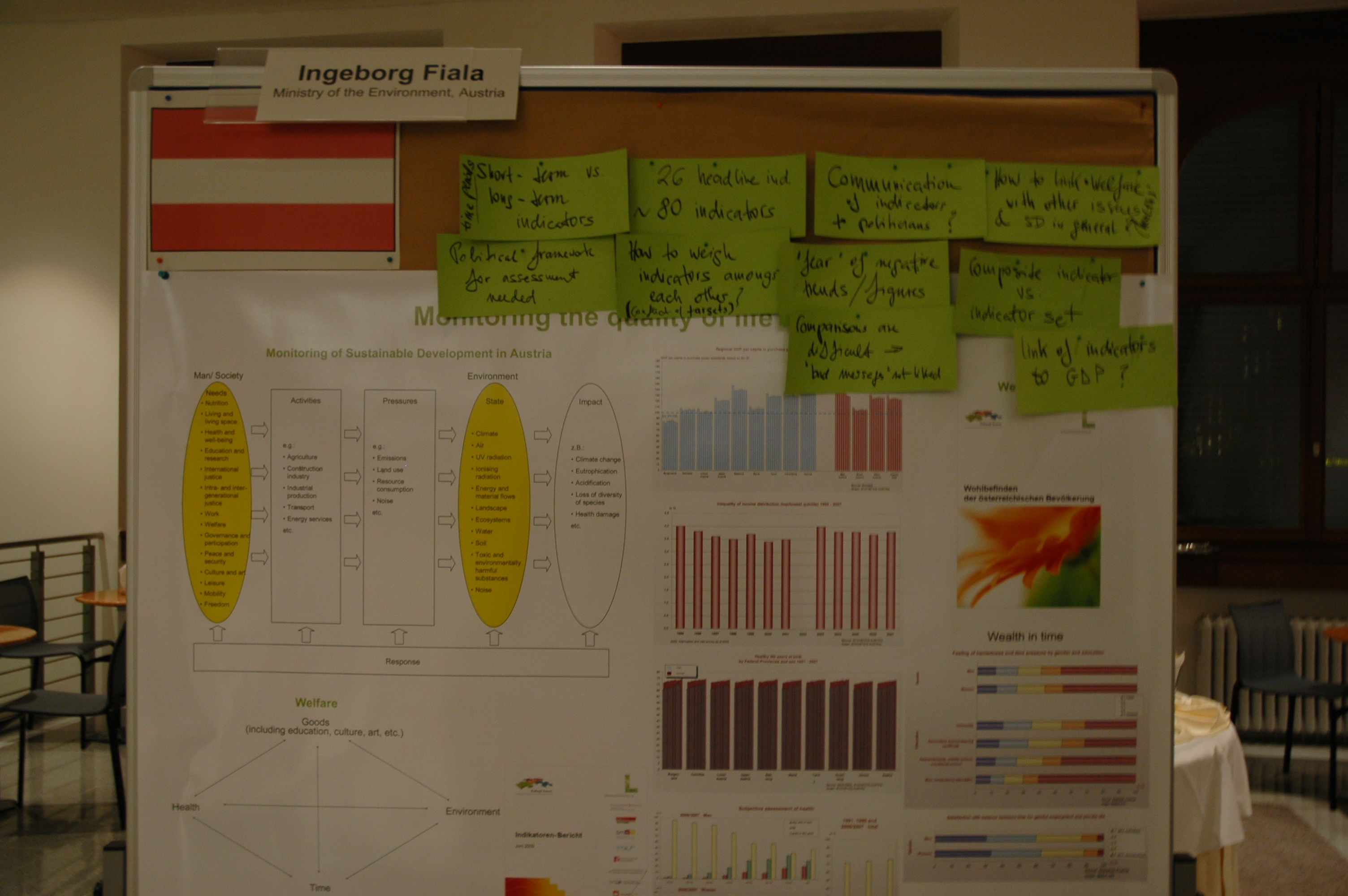 The recent financial and economic crisis and the challenges posed by various sustainable development issues (e.g. climate change, natural resource consumption, poverty reduction, etc.) led to a questioning of conventional approaches of economic growth and of traditional means of measuring progress, wealth and prosperity in our societies only in terms of growth domestic product (GDP). Since several years, international, European and national institutions have engaged in developing measuring systems for progress and wealth that aim to go “beyond GDP” and that increasingly take into account sustainable development. Among them are the EU’s initiative “Beyond GDP – measuring progress, true wealth and the well-being of nations”, the work of the Commission on the Measurement of Economic Performance and Social Progress which was established by the French President, Nicolas Sarkozy, and led by the Nobel prize winner, Joseph Stiglitz, as well as a global project on “Measuring the Progress of Societies” which is hosted by the OECD and run in collaboration with other international and regional partners. All these initiatives and their work have not only found their way into statistical offices but have also spurred lively political debates. Generally, the ways and means of how to measure progress, wealth and prosperity play a crucial role in the concepts and implementation of national sustainable development strategies and strategies that aim at linking economic growth and sustainable development (e.g. Europe 2020 strategy, OECD’s Green Growth Strategy, UNEP’s Green Economy Initiative). The workshop contributed to current discussion on “beyond GDP” by focussing on questions such as: What are the linkages and challenges between sustainable development policies and measurement? What is the current status of international and national reform processes to measure welfare and wealth? Which options for concrete actions are possible on the national level and in cooperation among countries?