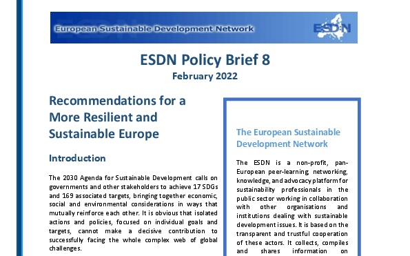 As many European countries are finalizing their Recovery and Resilience Plans, the topic of resilience and sustainable development is timely and important. It is because of this importance that the ESDN and the Slovenian Ministry for the Environment and Spatial Planning organized the ESDN Conference 2021 on the topic of “European Recovery and Resilience Mechanisms – Challenges in Systemic Approaches in Sustainable Development”. The insights from the Conference discussions inform the recommendations for this Policy Brief. The Conference had over 120 sustainable development practitioners and experts as participants from 22 countries.