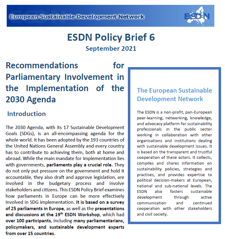 Parliaments are a key actor in the implementation of the 2030 Agenda. A new Policy Brief on Recommendations for Parliamentary Involvement in the Implementation of the 2030 Agenda addresses the mechanisms and tools that parliamentarians can use to become involved in their country’s SDG implementation process. This includes recommendations on building effective structures that work for the individual parliament, monitoring progress, and creating political will.